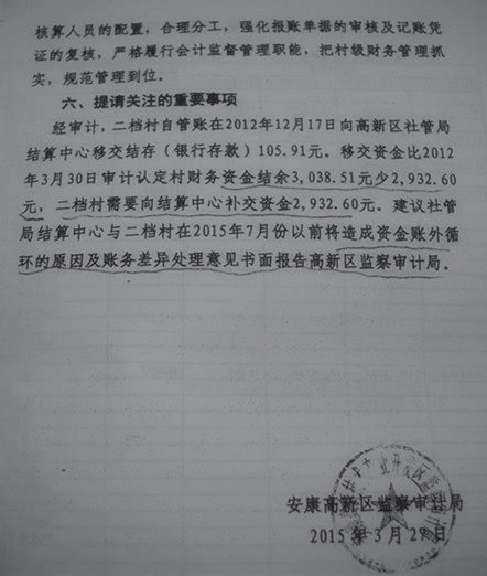 在記者獲悉的一份由安康高新技術(shù)產(chǎn)業(yè)開發(fā)區(qū)監(jiān)察審計(jì)局的審計(jì)報(bào)告【安高新審報(bào)(2015)19號(hào)】里看到,該審核報(bào)告審計(jì)了二檔村2012年4月到2014年12月的財(cái)務(wù)收支情況,該報(bào)告第五部分認(rèn)為二檔村一是未按規(guī)定編制資產(chǎn)負(fù)債表,未建立固定資產(chǎn)賬,未指定專人負(fù)責(zé)對(duì)報(bào)賬單據(jù)進(jìn)行審核,未對(duì)記賬憑證進(jìn)行復(fù)核,記賬憑證要素不全;二是會(huì)計(jì)記賬憑證無(wú)原始單據(jù)支撐,報(bào)賬憑證簽字手續(xù)不全;三是賬務(wù)處理錯(cuò)誤;四是往來(lái)款項(xiàng)長(zhǎng)期掛賬不清理。