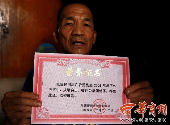 除了擁有一份穩(wěn)定收入,在學校,張安民也曾有過自豪,“張師傅,你辛苦了”、“張師傅,咱學校的美麗也有您一份功勞”……大大小小領導、老師、學生諸如此類的話,都讓他獲得感動,2008年和2011年,還因表現優(yōu)異,學校后勤集團先后給他頒發(fā)了兩次榮譽證書。