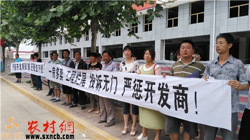 7月6日上午,在武功農(nóng)貿(mào)市場(chǎng)在建項(xiàng)目工地上,記者見(jiàn)到了幾十名在這里購(gòu)買商鋪的群眾,據(jù)他們介紹,這個(gè)農(nóng)貿(mào)市場(chǎng)由陜西正耀房地產(chǎn)開發(fā)有限公司開發(fā)承建,從2012年開始動(dòng)工建設(shè),因?yàn)榻ㄔO(shè)規(guī)模大、規(guī)劃比較合理,也同時(shí)是縣上確定的招商引資項(xiàng)目,因此吸引了不少投資者前來(lái)購(gòu)買商鋪。從2013年11月份開始到2014年年初,這里的商鋪幾乎銷售一空。按照合同約定,這些商鋪都必須全款一次性付清,并且合同標(biāo)明,2014年6月份為交房期限,商鋪的運(yùn)營(yíng)方式按照約定采取前三年由開發(fā)商統(tǒng)一經(jīng)營(yíng)、按照不同的標(biāo)準(zhǔn)對(duì)購(gòu)買商鋪者進(jìn)行租金每年10%不等的利潤(rùn)返還。準(zhǔn)商戶們說(shuō),繳納了全款,拿到了合同,大伙兒都安心等待一年之后的租金返還,可到了2014年年底,卻遲遲沒(méi)有接到開發(fā)商關(guān)于租金的發(fā)放消息,等大家跑到項(xiàng)目部詢問(wèn)時(shí),一個(gè)讓他們?cè)趺匆蚕氩坏降膯?wèn)題出現(xiàn)了。
