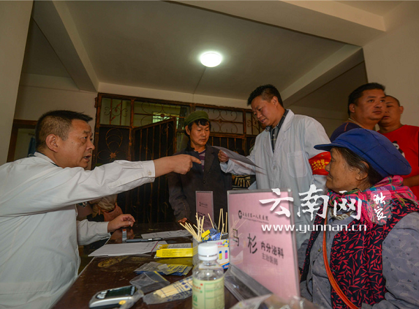 6月3日早上九點(diǎn),醫(yī)療隊(duì)的二十多位專家來到了獨(dú)龍江巴坡村,在當(dāng)?shù)卮逦瘯?huì)的門前搭起了簡易醫(yī)院。幾張桌子,幾條板凳構(gòu)成了這個(gè)臨時(shí)的“云南省第一人民醫(yī)院”。還沒等所有的設(shè)備準(zhǔn)備好,就有村民前來體檢就診。隨著時(shí)間的推移,越來越多的村民聚集到了這塊半個(gè)籃球場大的小廣場上,有的還是專門騎摩托車從別的地方趕來的。