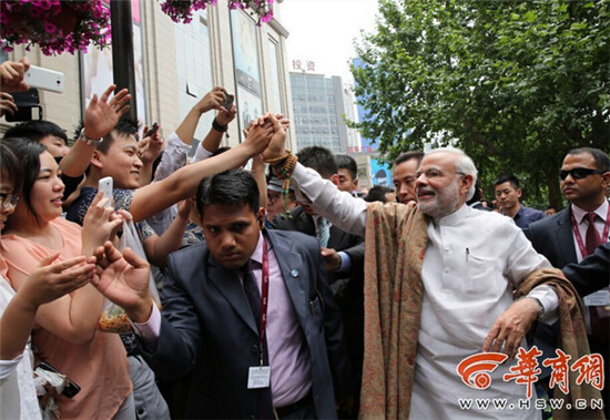 昨日下午1時(shí)許,莫迪在參觀完大興善寺后,和西安街頭歡迎的人們握手致意,人群里一位女士拎著涼皮拍莫迪。莫迪在微博中說(shuō):『非常高興看到中國(guó)人民的熱情』
