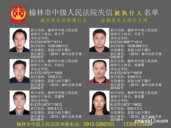 據(jù)了解,榆林為了加大對“老賴”的懲戒力度,維護當事人的合法權益。從2014年10月以來,榆林市中級人民法院先后兩次通過官方微博、微信公眾平臺和平面媒體發(fā)布了失信被執(zhí)行人信息。