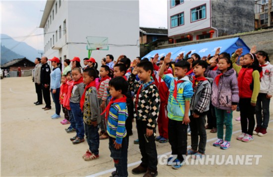貴州省劍河縣南加鎮(zhèn)新柳小學(xué)的學(xué)生們?cè)趶?fù)課典禮上舉行升旗儀式。新華社發(fā)(彭文貴攝)