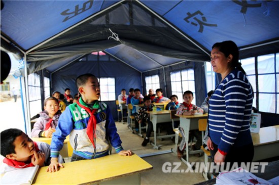 4月1日,師生們?cè)谫F州省劍河縣南加鎮(zhèn)新柳小學(xué)臨時(shí)帳篷課堂上互動(dòng)。新華社發(fā)(彭文貴攝)
