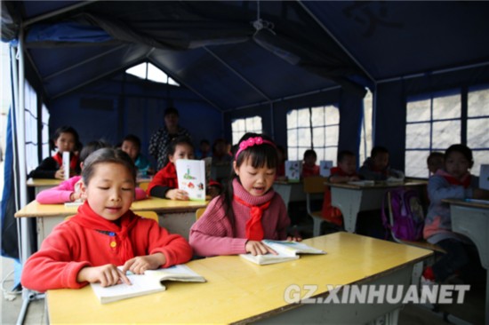 4月1日,貴州省劍河縣南加鎮(zhèn)新柳小學(xué)學(xué)生在臨時(shí)帳篷教室里讀書。新華社發(fā)(彭文貴攝)