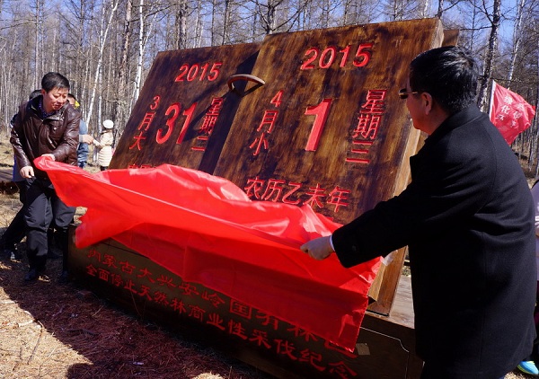 3月31日,內(nèi)蒙古森工集團常務(wù)副總經(jīng)理趙寶軍(右)和副總經(jīng)理田鳳奇為停伐紀念碑揭牌。新華社記者 鄒儉樸 攝