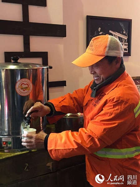 人民網(wǎng)成都3月3日電(宋艷)茶水任意喝、微波爐放心用……在“環(huán)衛(wèi)驛站”里,身穿橙色工作服的環(huán)衛(wèi)工人安心地喝著水。