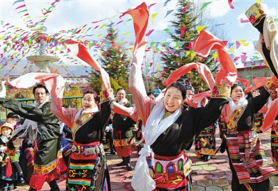 2月19日,拉薩西郊安居苑的藏族同胞歡聚在一起,載歌載舞,相互敬獻(xiàn)“切瑪”、敬獻(xiàn)哈達(dá),共同慶祝藏歷新年。
