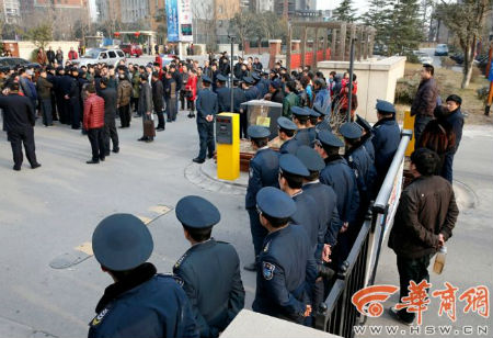 昨日下午,百名租住客聚集在小區(qū)大門前,小區(qū)保安在門口排成人墻,以防不測