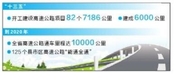 2017年6月21日,省委、省政府再次加碼高速公路建設(shè)。當(dāng)天召開的全省加快高速公路建設(shè)推進(jìn)會提出,堅(jiān)決打贏縣域高速公路“能通全通”攻堅(jiān)戰(zhàn),除生態(tài)環(huán)境不宜修高速公路的貢山、福貢、德欽、維西4個(gè)縣之外,用3年時(shí)間實(shí)現(xiàn)其他125個(gè)縣(市、區(qū))縣縣通高速?!笆濉遍_工建設(shè)高速公路項(xiàng)目82個(gè)7186公里,建成6000公里。到2020年,全省高速公路通車?yán)锍踢_(dá)到10000公里。