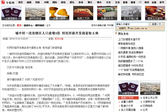 2014年11月27日東方今報網(wǎng)一則題為《城中村一改造轄區(qū)人口虛增3倍村民懷疑開發(fā)商套取土地》的新聞引起了廣大網(wǎng)民及新聞媒體的關(guān)注轉(zhuǎn)載。