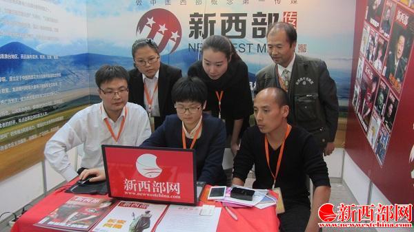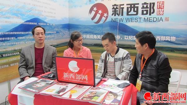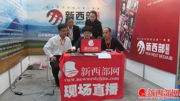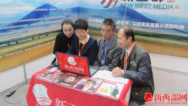 西安新西部出版?zhèn)髅接邢挢?zé)任公司CEO王巨川(右二)察看新西部雜志社展位,指導(dǎo)新西部網(wǎng)直播工作,聽取新西部網(wǎng)主任王順利(右一)、新西部網(wǎng)編輯杜林杰(左二)、新西部雜志社綜合管理部王天恬(左一)匯報(bào)工作。