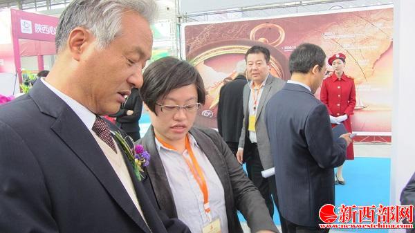 陜西振彰食品有限公司大客戶部主管楊媛婷(前左二)向陜西省質(zhì)量技術(shù)監(jiān)督局黨組書記、局長(zhǎng)仵西居(前左一)介紹御品軒蛋糕。新西部網(wǎng) 王順利攝