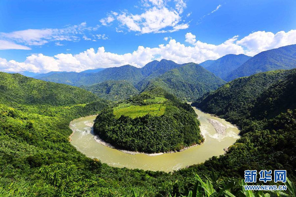 位于墨脫境內(nèi)的雅魯藏布江大拐彎(10月6日攝)。“墨脫”藏語意為“隱秘的蓮花”,位于西藏自治區(qū)東南部林芝地區(qū),地處雅魯藏布江下游,喜馬拉雅山脈東端南麓。這里環(huán)境優(yōu)美、雨量充沛、生態(tài)保存完好,也是西藏高原海拔最低的地方。每年十月是墨脫一年之中最美季節(jié),其獨特的景致吸引著大量的游客。新華社發(fā)(劉鳳英攝)