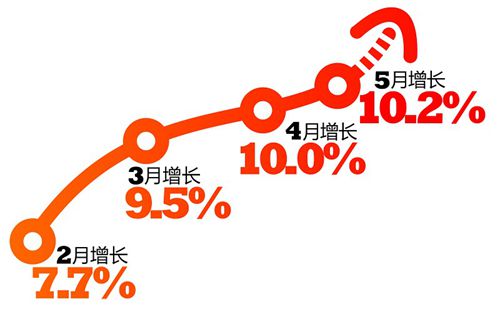 工業(yè)方面,今年以來(lái),受市場(chǎng)需求不足影響,全省工業(yè)增速同比大幅回落,但在汽車(chē)制造、電子信息等重點(diǎn)行業(yè)持續(xù)較快增長(zhǎng),煤炭行業(yè)逐步復(fù)產(chǎn),新入庫(kù)企業(yè)數(shù)量增加等有利因素拉動(dòng)下,1-5月全省規(guī)模以上工業(yè)增加值增速比前4月回升0.1個(gè)百分點(diǎn),比一季度提高0.3個(gè)百分點(diǎn)。其中,2月增長(zhǎng)7.7%,3月增長(zhǎng)9.5%,4月增長(zhǎng)10.0%,5月增長(zhǎng)10.2%,拉出一道上揚(yáng)曲線(xiàn)。