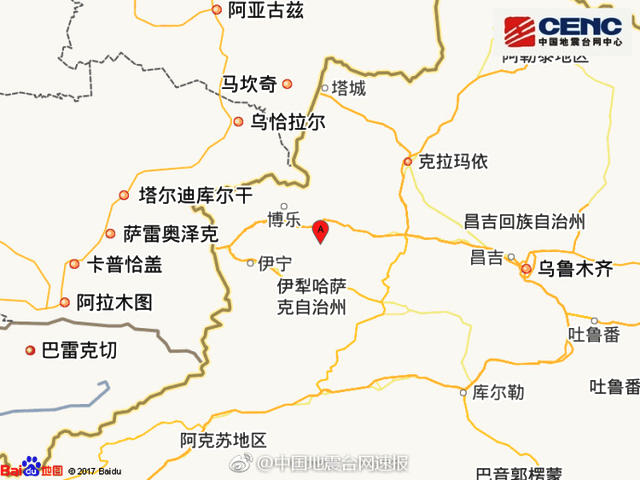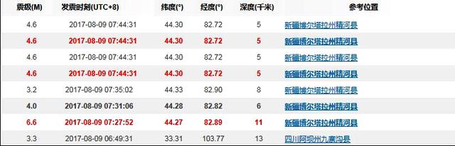 中國地震臺網(wǎng)正式測定:2017年08月09日07時27分52秒在新疆博爾塔拉州精河縣(北緯44.27度,東經(jīng)82.89度)發(fā)生6.6級地震,震源深度11千米。