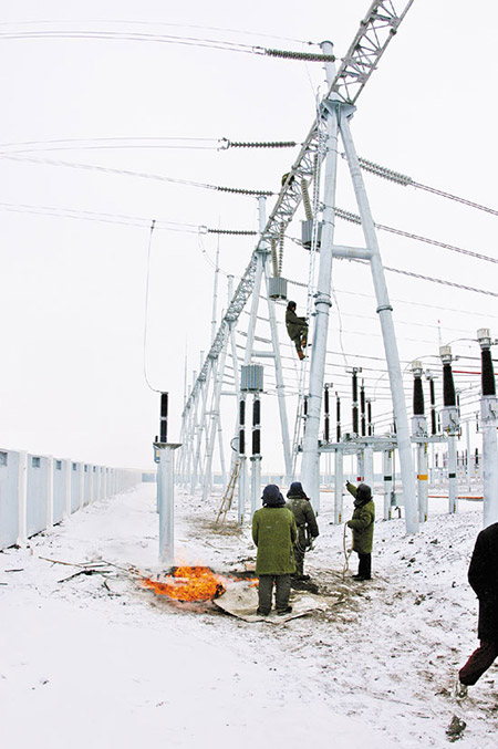 高寒地帶的錫林郭勒有效施工期短,圖為太仆寺電力公司職工在2013年寒冬施工場景。
