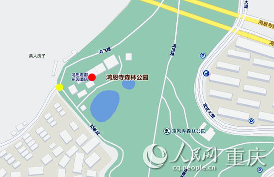在百度地圖上,紅圈處為鴻恩君御花園酒店所在地,黃圈處為鴻恩寺森林公園一出口。