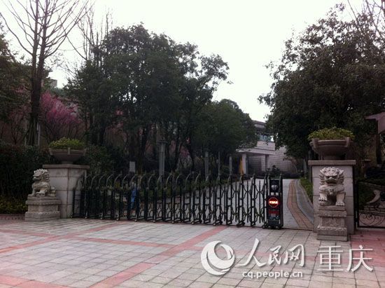 記者轉(zhuǎn)身邁上了公園的臺階,在經(jīng)過一些桂花樹后,記者左轉(zhuǎn)至鴻飛路上,不多時,一棟三層連體建筑引入眼簾。由于被柵欄圍著,記者再次左行,便來到了一個關(guān)閉狀態(tài)的伸縮閘前。該閘兩側(cè)分別坐落著一個白色石獅,靠右的石獅旁有個保安亭。