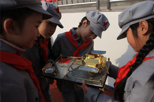 2月19日,廣安紅軍小學(xué)學(xué)生觀看航天模型。新華社發(fā)(劉長龍 攝)