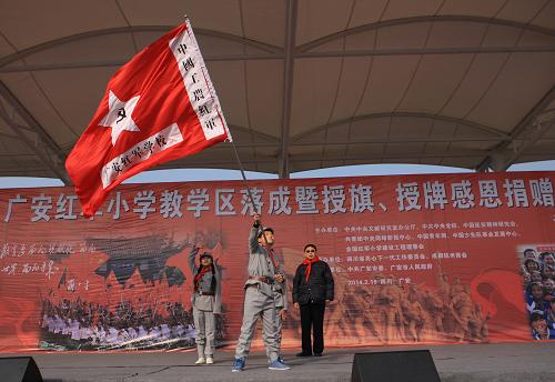 2月19日,廣安紅軍小學(xué)學(xué)生在授旗授牌儀式上揮舞校旗。當(dāng)日,全國紅軍小學(xué)建設(shè)工程理事會(huì)在四川廣安舉行廣安紅軍小學(xué)授旗授牌儀式。儀式上,各界人士為學(xué)校捐贈(zèng)電教產(chǎn)品、圖書、服裝、航天模型等。新華社發(fā)(劉長龍 攝)