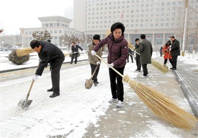 昨天,自治區(qū)主席劉慧(前右)帶頭與自治區(qū)其他領(lǐng)導(dǎo)及政府機(jī)關(guān)人員一同拿起鐵鍬、掃把清除道路積雪。 本報(bào)記者王猛攝
