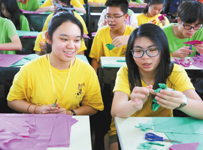 7月5日,由國務(wù)院僑辦和廣西壯族自治區(qū)僑辦聯(lián)合主辦的2017年海外華裔青少年“中國尋根之旅”夏令營在廣西賀州市舉行。來自中國、印度尼西亞、泰國的營員參加了這次夏令營活動,一起體驗中國傳統(tǒng)文化。圖為兩名東盟國家營員在學(xué)習(xí)中國傳統(tǒng)剪紙技藝。