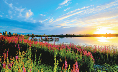 日前,甘肅省張掖市普降中雨,中午以后雨停,傍晚出現(xiàn)美麗晚霞,吸引在濕地游覽的許多市民觀看拍照。圖為當(dāng)?shù)厥忻裨诟拭C張掖國家濕地公園觀看和拍攝晚霞。陳 禮攝