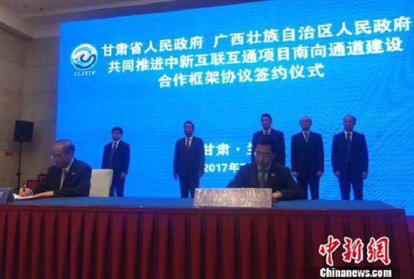 中新網(wǎng)蘭州7月5日電 (記者 劉玉桃)5日,甘肅省與廣西壯族自治區(qū)共同推進(jìn)中新(中國與新加坡)互聯(lián)互通項(xiàng)目南向通道建設(shè)合作框架協(xié)議簽約儀式在蘭州舉行,這標(biāo)志著甘肅正式融入中新互聯(lián)互通項(xiàng)目南向通道建設(shè)。