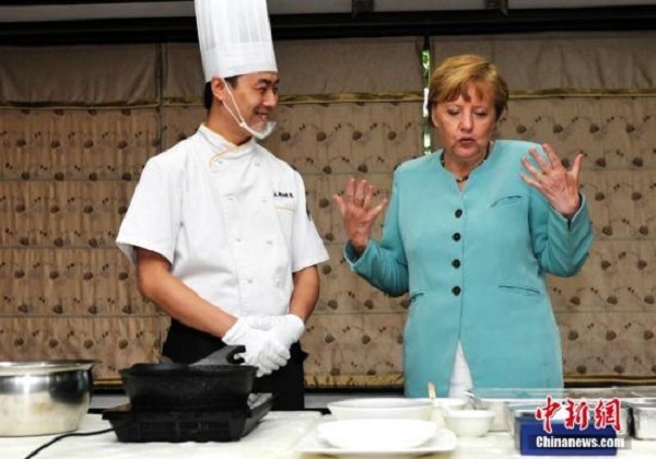 資料圖:德國(guó)總理默克爾向川菜大廚學(xué)習(xí)宮保雞丁的做法。中新社發(fā) 安源 攝