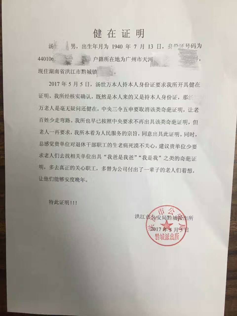 5月5日,湖南一位7旬老人被自己退休前的單位要求開《健在證明》,派出所出具證明后批評該單位“對退休職工的生老病死漠不關心”,同時建議“少要求老人開奇葩證明”。