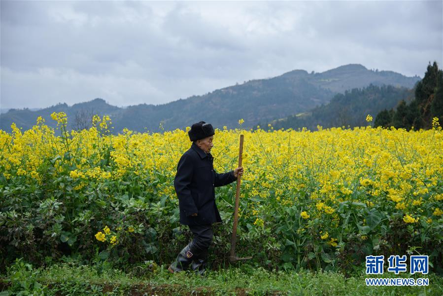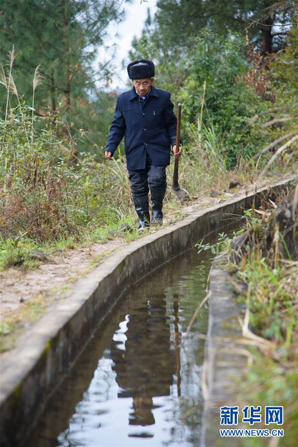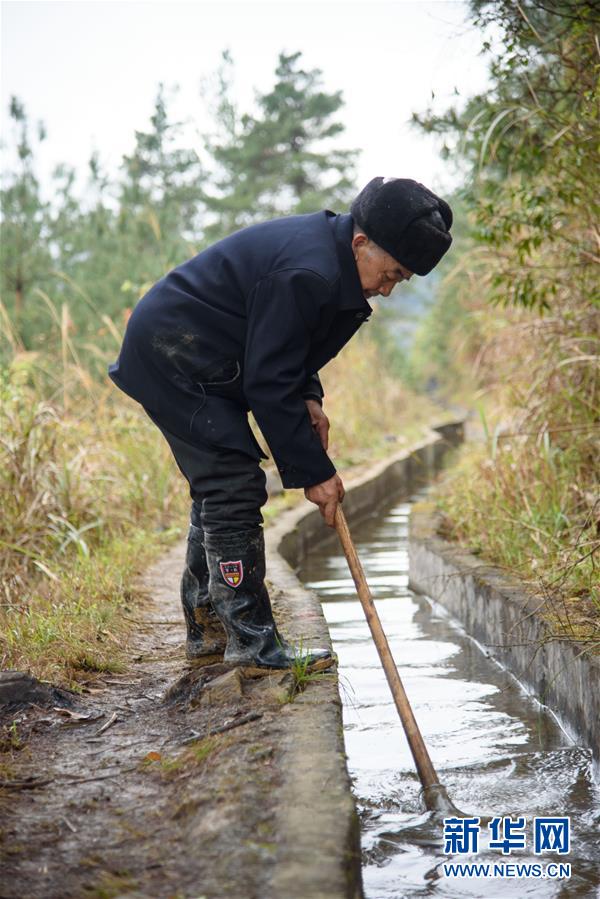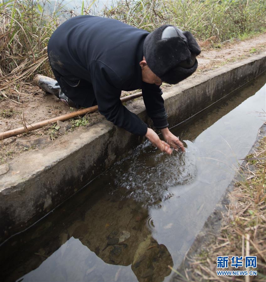 2017年3月24日,黃大發(fā)正在用鋤頭清理水渠。新華社記者 劉續(xù) 攝