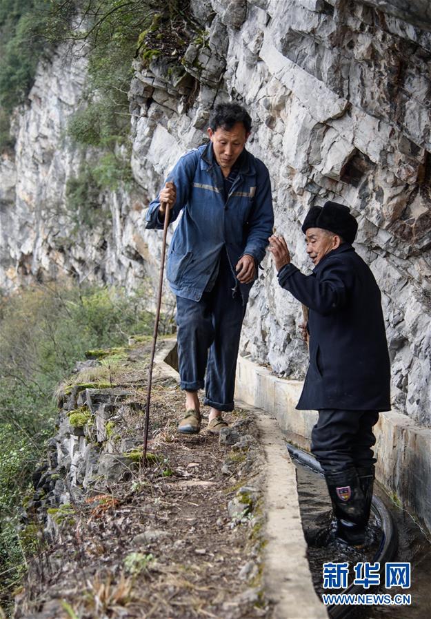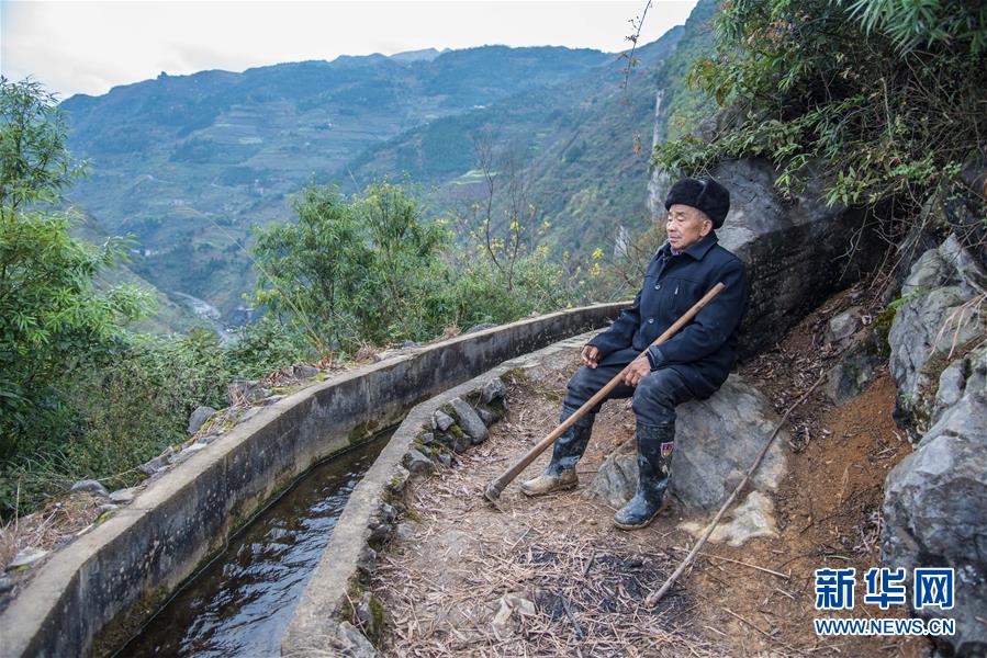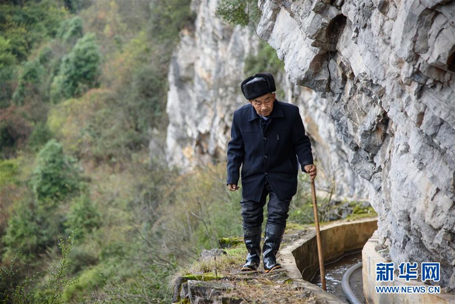 2017年3月24日,黃大發(fā)在巡查水渠途中,身旁就是懸崖。新華社記者 劉續(xù) 攝
