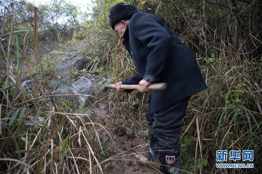 2017年3月24日,在通往水渠的路上道路難行,黃大發(fā)用鋤頭挖出道路。新華社記者 劉續(xù) 攝