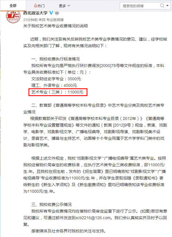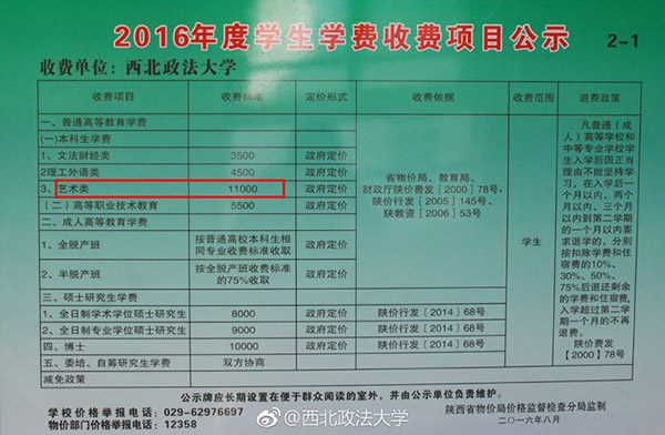 對于學生的質(zhì)疑,3月31日,西北政法大學在官方微博上發(fā)布《關(guān)于我校藝術(shù)類專業(yè)收費情況的說明》,稱:我?!皯騽∮耙曃膶W”、“廣播電視編導(dǎo)” 屬藝術(shù)類專業(yè),按照我校經(jīng)省物價局審定的收費標準,應(yīng)執(zhí)行藝術(shù)類專業(yè)三類收費標準,即11000元/生.年。