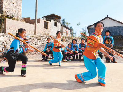 從羅平縣城出發(fā),山道彎彎,一路攀行,大補(bǔ)董村就隱藏在滇、黔、桂三省交界的群山深處。公路逼仄,牛群歸圈,頭牛似乎少有與汽車遭遇的經(jīng)驗(yàn),掉頭便跑,驚得鴉雀們“撲棱棱”四下亂飛。翻過一個(gè)埡口后,一座形似牛頭綴飾的彝家寨門出現(xiàn)了。