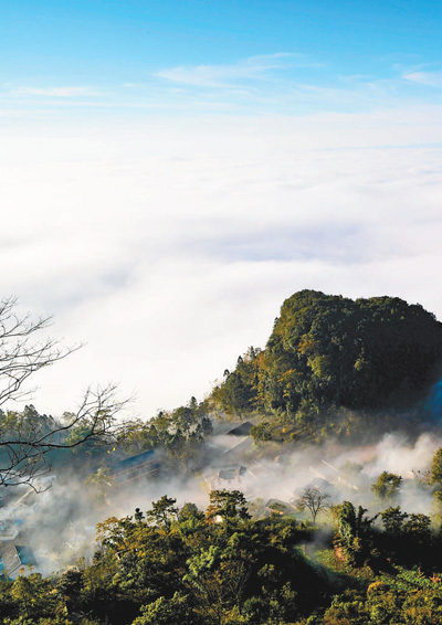 繼續(xù)前行,眼前是一座孤峰。登頂氣喘未定,舉目四望,落日熔金,遠(yuǎn)處一簇簇山峰涌起,不似一片片森林,卻如一望無盡的山峰匯成的大海。回望大補(bǔ)董村,恰在一絲白云下面,“山頂上的美麗人家”,一行人不禁感嘆彝語描述的精妙。