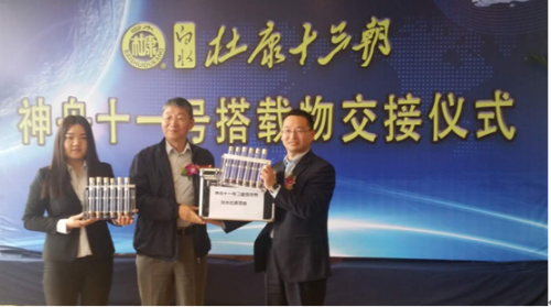 交接儀式上,由中國空間技術(shù)研究院航天神舟生物科技集團(tuán)董事、總工程師、中國酒類流通協(xié)會會長助理吳勇向陜西白水杜康酒業(yè)集團(tuán)總經(jīng)理李勇交接了 “神舟十一號”太空飛船搭載的白水杜康酒曲和窖泥等物。