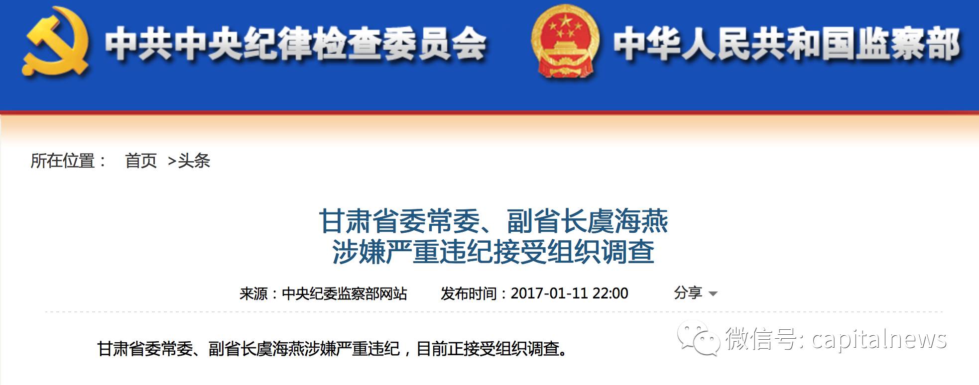 虞的落馬,頗為突然。2016年10月,虞海燕離任蘭州市委書記,另有任用。