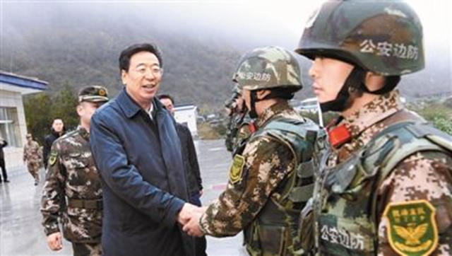 西藏日?qǐng)?bào)報(bào)道,10月12日,西藏自治區(qū)黨委書記吳英杰深入山南市隆子縣就促進(jìn)邊境地區(qū)發(fā)展與穩(wěn)定、改善各族群眾生產(chǎn)生活條件、加強(qiáng)基層黨建、精準(zhǔn)扶貧等工作進(jìn)行考察調(diào)研。圖為10月12日吳英杰在隆子縣玉麥鄉(xiāng)看望慰問(wèn)公安邊防官兵。(圖片來(lái)自西藏日?qǐng)?bào))