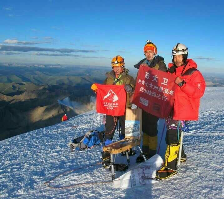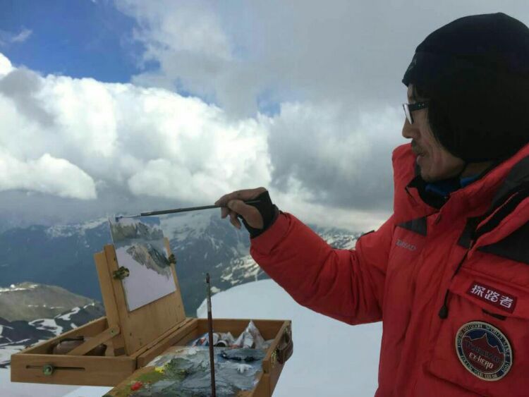 多年以來,陳大衛(wèi)以登山探險的方式,親臨高山極地進行繪畫創(chuàng)作,致力于登山運動與藝術(shù)的融合。圖為陳大衛(wèi)在攀登過程中寫生。