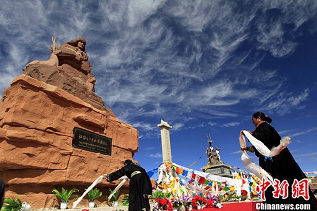 現(xiàn)在,騎行者穿越可可西里時會在索南達(dá)杰的碑前獻(xiàn)上哈達(dá)或點燃一支煙;巡山隊員們每次經(jīng)過此地時,都會下車默哀;青藏線上的大車司機(jī)每次到昆侖山口時,都會鳴笛,撒上象征吉祥的風(fēng)馬;許多年輕人追隨他的腳步,走上環(huán)保道路。圖為2013年索南達(dá)杰紀(jì)念雕像在昆侖山口落成。