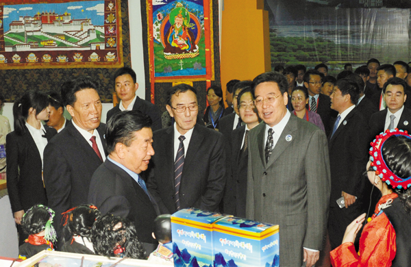 吳英杰、向巴平措、洛桑江村等與中外嘉賓一起步入展館,邊走邊看,認(rèn)真聽取講解。在西藏唐卡藝術(shù)、藏族礦物植物顏料制作、西藏陶器制作技藝等館區(qū),大家不時(shí)停下腳步,饒有興致地駐足觀看;“美麗家園幸福拉薩”“藏源雅礱幸福山南”“人間凈地醉美林芝”……七地市展館推出的精品旅游景點(diǎn)和特色旅游產(chǎn)品受到參觀的領(lǐng)導(dǎo)和嘉賓一致好評(píng);在“西藏好水世界共享”展館,“5100”“珠峰冰川”“西藏神水”等區(qū)內(nèi)十幾個(gè)品牌的天然飲用水整齊擺放,讓人看到了我區(qū)天然飲用水產(chǎn)業(yè)良好的發(fā)展勢(shì)頭和巨大的發(fā)展前景;藏毯、卡墊、佛像、飾品……來自西藏、青海和尼泊爾等地的商品極大豐富了展覽內(nèi)容……