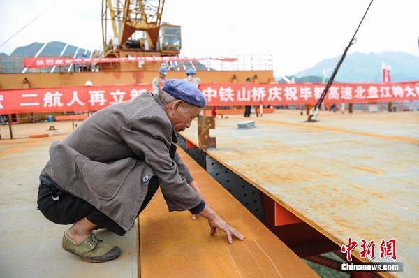 兩位老人走在即將合龍的北盤(pán)江大橋橋上。中新社記者 賀俊怡 攝 (來(lái)自:中新網(wǎng))