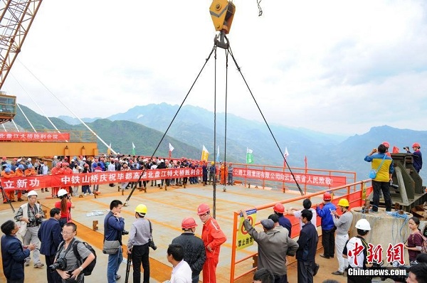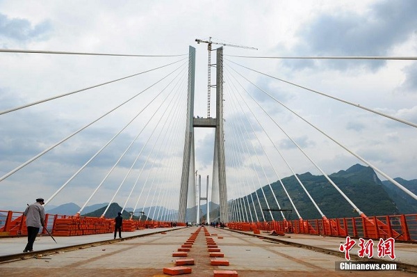 北盤(pán)江大橋最后一塊橋面板安裝完畢。中新社記者 賀俊怡 攝 (來(lái)自:中新網(wǎng))