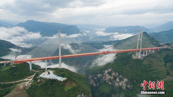9月10日,由貴州、云南兩省合作共建的世界第一高橋——杭瑞高速貴州省畢節(jié)至都格(黔滇界)高速公路北盤(pán)江大橋?qū)崿F(xiàn)合龍。北盤(pán)江大橋是杭瑞高速畢都段的控制性工程,位于云南省和貴州省交界處,北盤(pán)江大橋橋面至江面高差達(dá)565米,超越之前世界第一高橋四渡河特大橋的560米,成為目前世界第一高橋,大橋主橋?yàn)殇撹炝盒崩瓨?,主?20米,畢都高速公路全線預(yù)計(jì)今年底可建成通車(chē)。 中新社記者 賀俊怡 攝 (來(lái)自:中新網(wǎng))