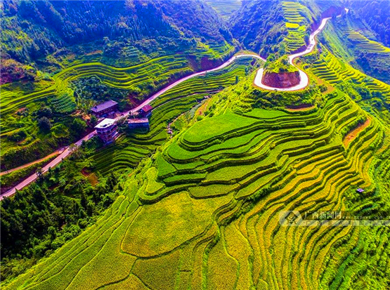 進入9月,龍勝各族自治縣泗水鄉(xiāng)潘內村梯田景呈現(xiàn)“大地染金”的美麗景觀。層層疊疊的梯田、錯落有致的民族村寨、涓涓細流的小溪、蜿蜒崎嶇的農村公路相互交織在一起,形成了一幅幅色彩斑斕的天然油畫,美不勝收。