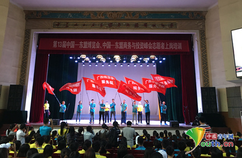 中國(guó)青年網(wǎng)北京9月8日電(記者 李川 通訊員 李麗莉)9月4日,1679名“兩會(huì)”志愿者歡聚一堂,在廣西民族大學(xué)大禮堂參加第13屆中國(guó)—東盟博覽會(huì)、中國(guó)—東盟商務(wù)與投資峰會(huì)志愿者培訓(xùn)暨上崗儀式。中國(guó)—東盟博覽會(huì)秘書處副秘書長(zhǎng)黃平西、共青團(tuán)廣西區(qū)委副書記劉玄啟、廣西民族大學(xué)黨委副書記廖安平出席上崗儀式。
