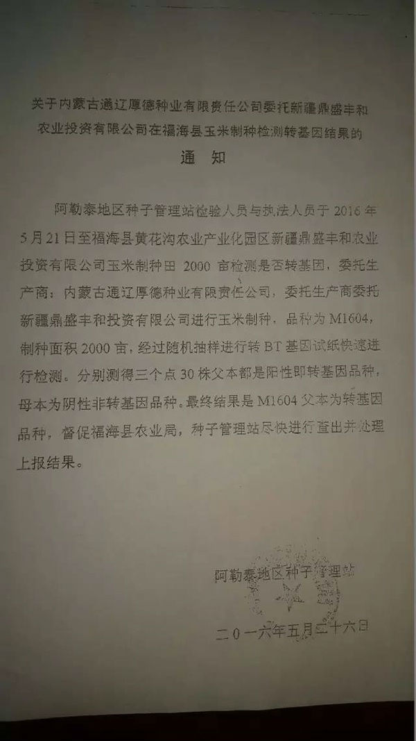 “轉(zhuǎn)基因檢測(cè)結(jié)果通知”顯示,阿勒泰地區(qū)種子管理站檢測(cè)人員于2016年5月21日至福??h黃花溝農(nóng)業(yè)產(chǎn)業(yè)化園區(qū)新疆鼎盛豐和農(nóng)業(yè)投資有限公司玉米制種田2000畝檢測(cè)是否轉(zhuǎn)基因,經(jīng)過(guò)隨機(jī)抽樣進(jìn)行BT基因試紙快速進(jìn)行檢測(cè),分別測(cè)得三個(gè)點(diǎn)30株父本都是陽(yáng)性即轉(zhuǎn)基因品種,母本為陰性非轉(zhuǎn)基因品種。