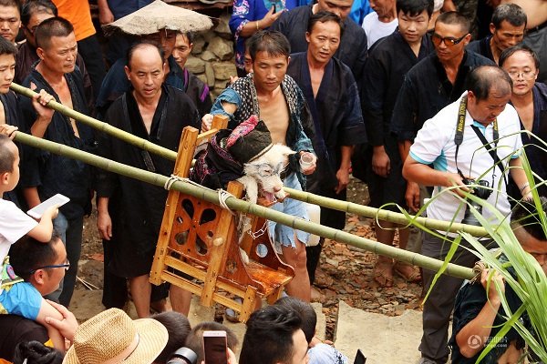 2016年8月14日,貴州省劍河縣革東鎮(zhèn)交榜村,人們?cè)凇疤Ч饭?jié)”活動(dòng)中抬狗游行?!疤Ч饭?jié)”民俗活動(dòng),吸引著四鄉(xiāng)八里的少數(shù)民族群眾前往感受這一神秘的民族節(jié)日。楊文斌 方鵬/東方IC